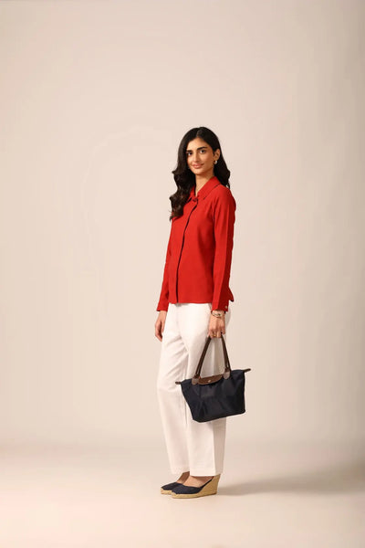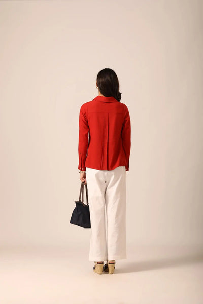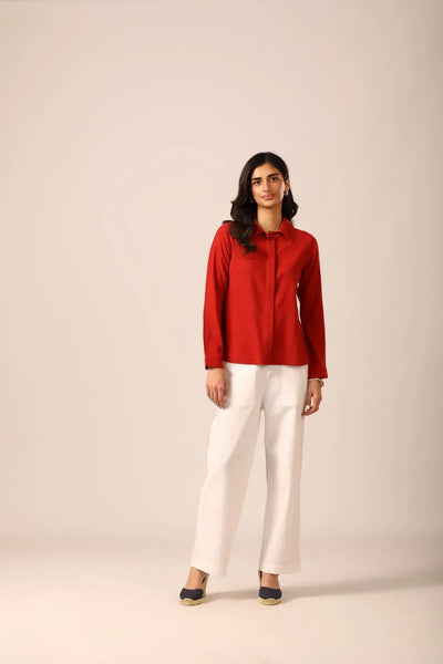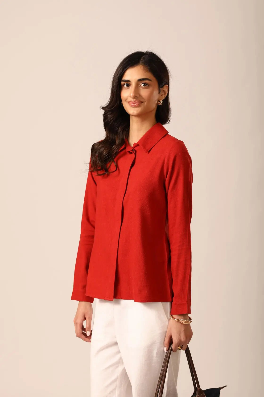 Add a vibrant touch to your wardrobe with this breathable linen shirt in a stunning red saffron hue. Featuring a classic button-down design and relaxed fit, it blends comfort with bold style. Perfect for casual days or layering for a chic look.
